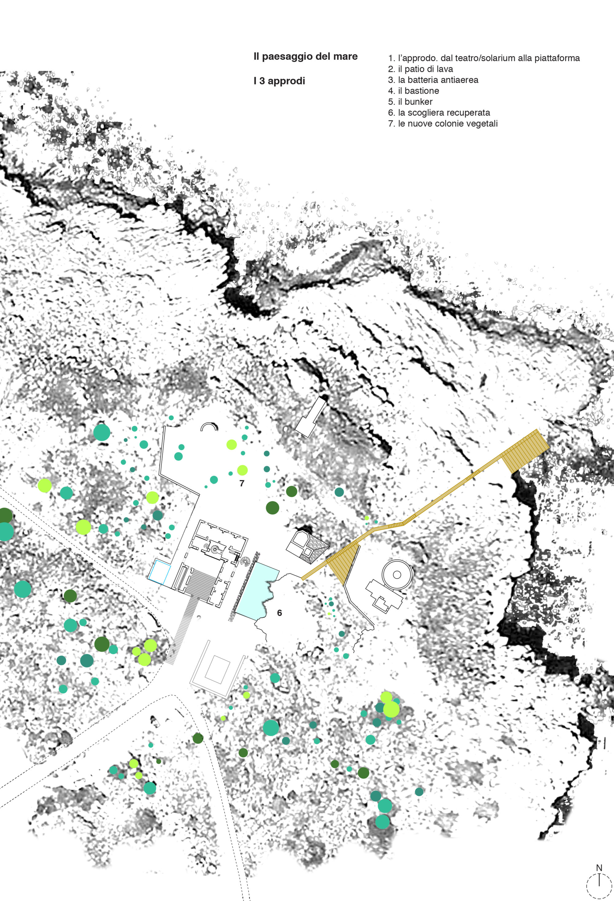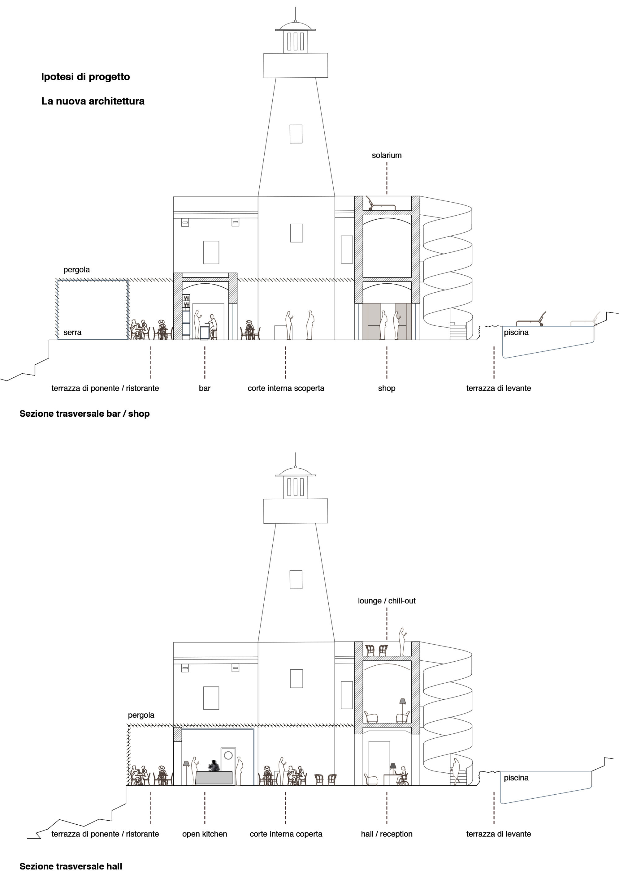 Quindi, ad esempio, abbiamo immaginato l’organizzazione degli spazi legata alle attività orientate allo svago e al tempo libero (piscina, beach club, palestra, escursioni, etc) da un’altra ottica abbiamo immaginato l’utilizzo degli spazi per attività più legate alla ripresa del contatto con se stessi, alla conoscenza, alla meditazione (yoga, cura del corpo, fitness, centro di formazione, piccola biblioteca multilingua, etc). Ancora, un uso giornaliero per eventi anche con catering proveniente dall’esterno, concerti, spettacoli e festival.